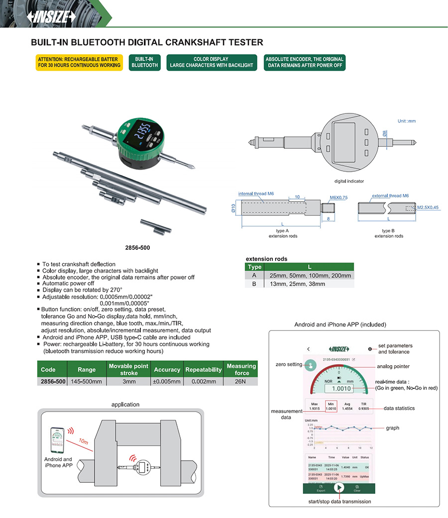 | 2856-500 | 145-500mm | ±0.005mm | 0.001mm/0.00005”, 0.0005mm/0.00002" | 0.002mm |