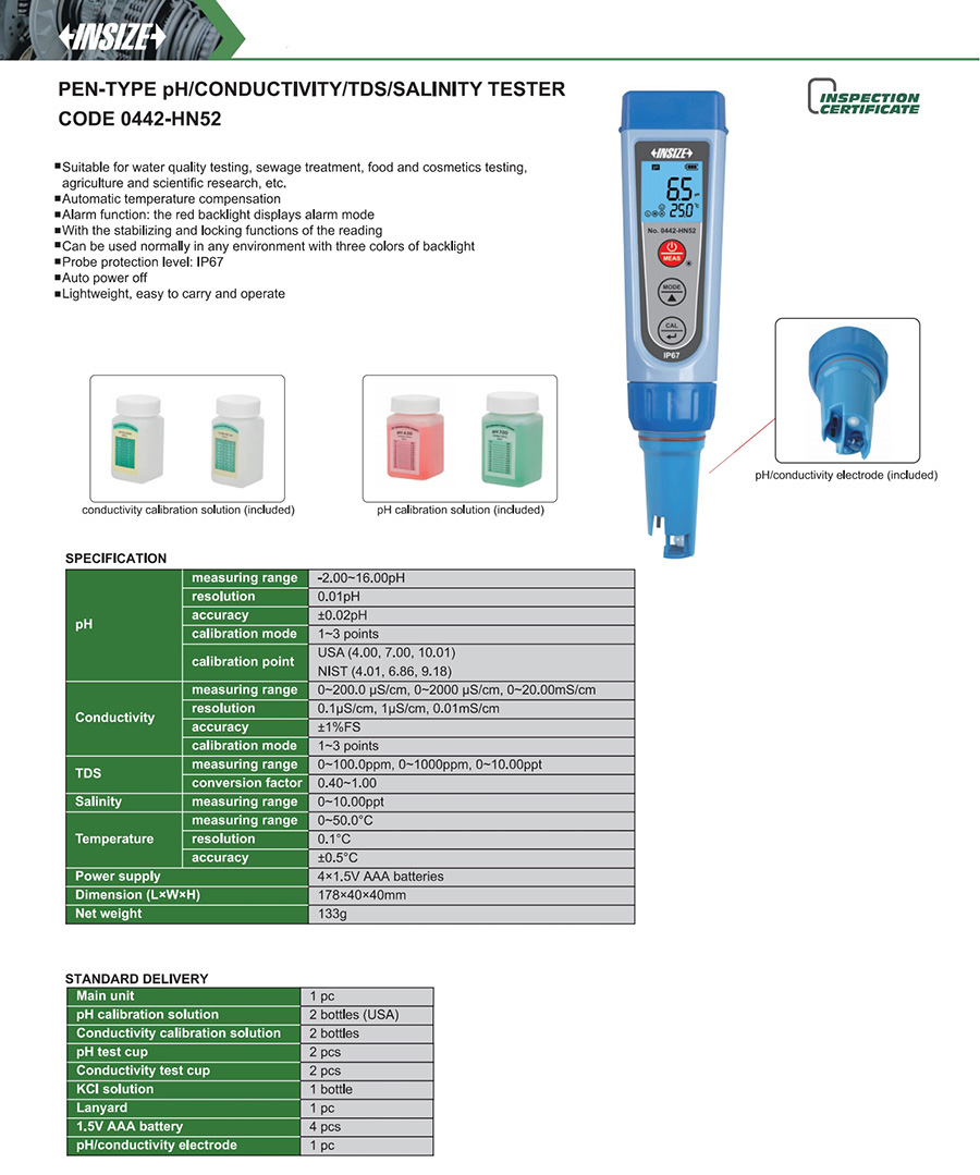 | 0442-HN52 | conductivity/TDS, pH | Off-line | pH: -2.00~16.00pH, conductivity: 0~200.0 µS/cm, 0~2000 µS/cm, 0~20.00mS/cm, TDS: 0~100.0ppm, A20~1000ppm, 0~10.00ppt | no |