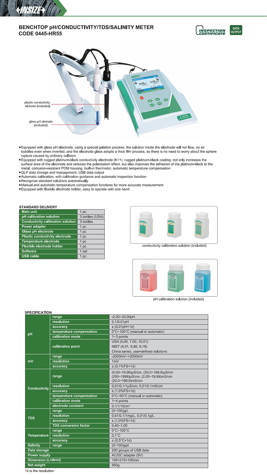 | 0445-HR55 | conductivity/TDS, pH/mV | Off-line | pH: -2.00~20.00pH, conductivity: (0.00~19.99)µS/cm, (20.0~199.9)µS/cm, (200~1999)µS/cm, (2.00~19.99)mS/cm, (20.0~199.9)mS/cm, TDS: (0~100)g/L | yes |