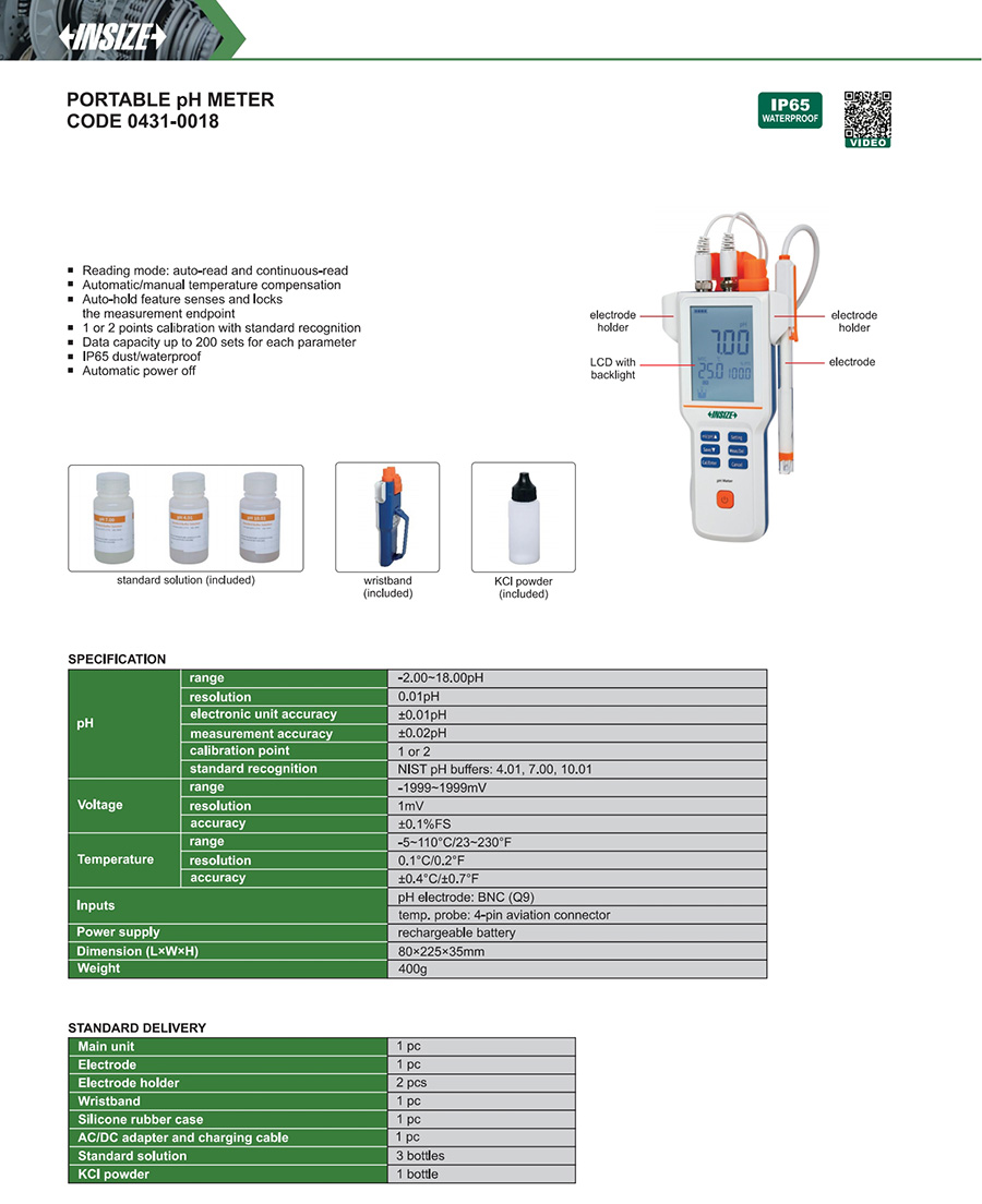 | 0431-0018 | pH/mV | off-line | -2.00~18.00pH, -1999~1999mV, -5~110°C/23~230°F | no |