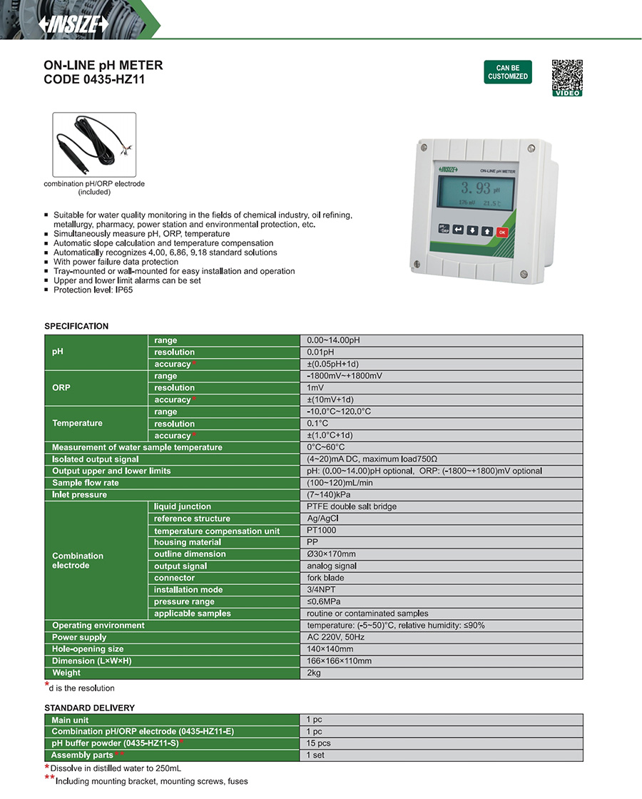 0435-HZ11 pH/mV on-line 0.00~14.00pH, -1800mV~+1800mV, -10.0°C~120.0°C yes