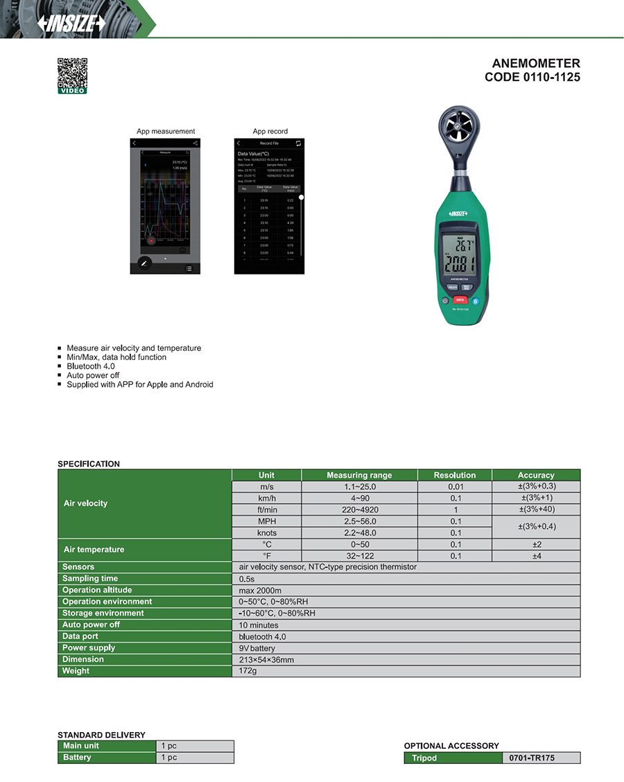 | 0110-1125 | 32~122°F | ±4°F | 0.1 | Air temperature |