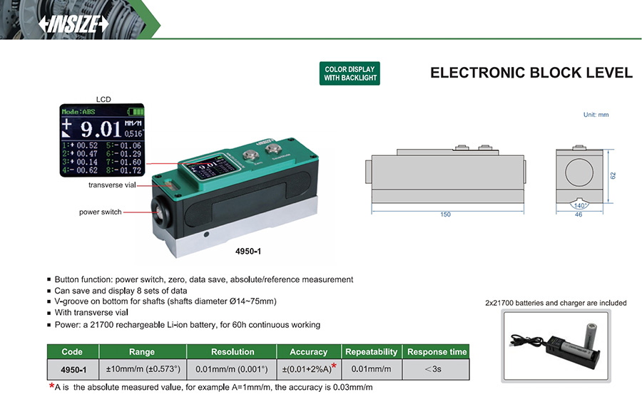 4950-1 ±10mm/m (±0.573°) ±(0.01+2%A) 0.01mm/m (0.001°) 0.01mm/m