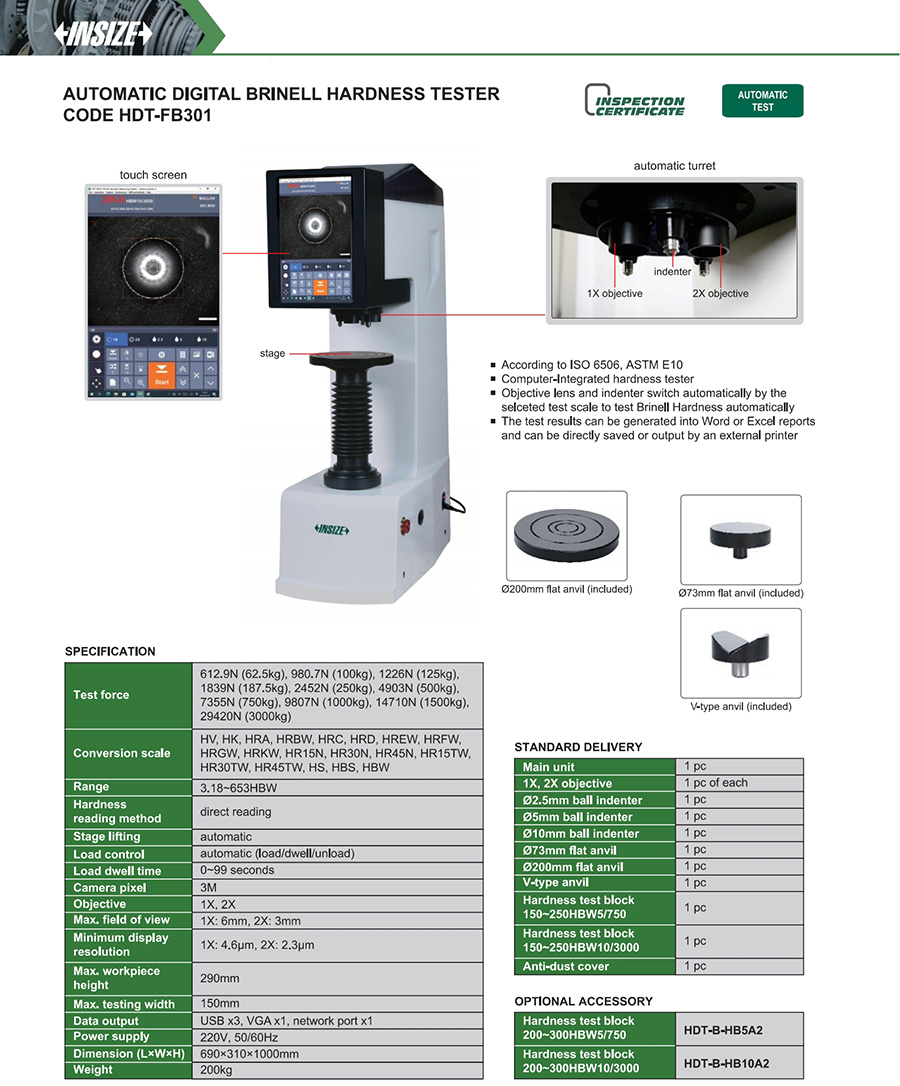 | HDT-FB301 | 3.18~653HBW | 62.5kg, 100kg, 125kg, 187.5kg, 250kg, 500kg, 750kg, 1000kg, 1500kg, 3000kg | 290mm | 150mm | automatic |