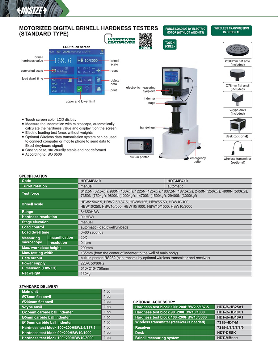 HDT-MB710 62.5kgf, 100kgf, 125kgf, 187.5kgf, 250kgf, 500kgf, 750kgf, 1000kgf, 1500kgf, 3000kgf automatic 200mm 135mm (form the center of indenter to the wall of main body) HBW2.5/62.5, HBW2.5/187.5, HBW5/125, HBW5/750, HBW10/100, HBW10/250, HBW10/500, HBW10/1000, HBW10/1500, HBW10/3000