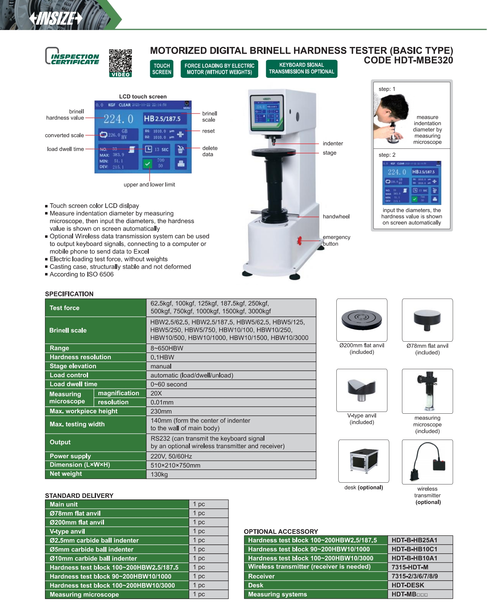 HDT-MBE320 62.5kgf, 100kgf, 125kgf, 187.5kgf, 250kgf, 500kgf, 750kgf, 1000kgf, 1500kgf, 3000kgf automatic (load/dwell/unload) 230mm 140mm (form the center of indenter to the wall of main body) HBW2.5/62.5, HBW2.5/187.5, HBW5/62.5, HBW5/125, HBW5/250, HBW5/750, HBW10/100, HBW10/250, HBW10/500, HBW10/1000, HBW10/1500, HBW10/3000
