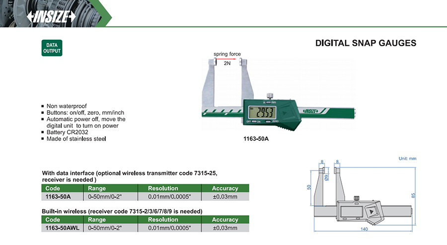 | 1163-50AWL | 0-50mm/0-2" | ±0.03mm | 0.01mm/0.0005" |