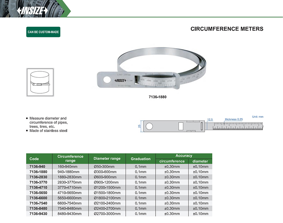 Code Graduation Diameter range Circumference range Circumference accuracy Diameter accuracy