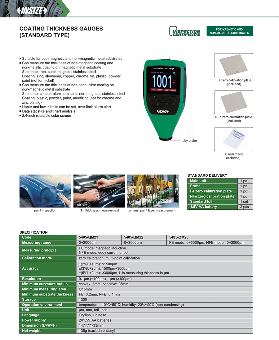 5405-QM23 FE mode: 0~5000μm, NFE mode : 0~3000μm ±(2%L+1µm): ≤1500µm, ±(3%L+2µm): 1500µm~3000μm, ±(5%L+2µm): ≥3000μm 0.1μm (<100μm), 1μm (≥100μm) no