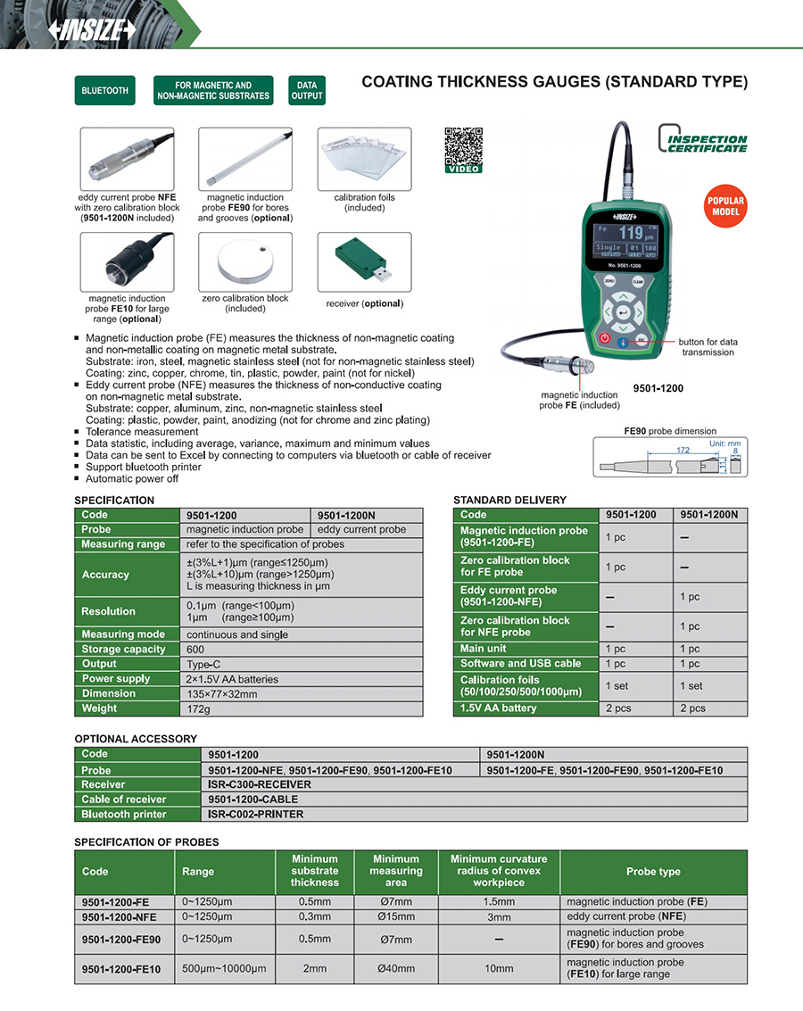 | 9501-1200N | 0~1250μm | ±(3%L+1)μm (range≤1250μm), ±(3%L+10)μm (range>1250μm) | 0.1μm (range<100μm), 1μm (range≥100μm) | Type-C |