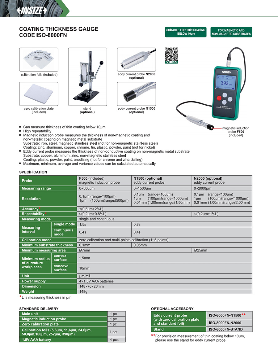 ISO-8000FN 0~500μm: F500 (included) magnetic induction probe ±(0.5μm+2%L) 0.1μm (range<100μm), 1μm (100μm≤range≤500μm) no