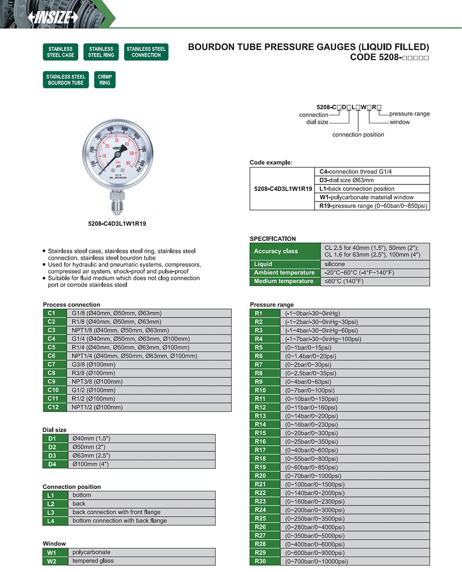 5208-□□□□□ G1/8, R1/8, NPT1/8, G1/4, R1/4, NPT1/4, G3/8, R3/8, NPT3/8, G1/2, R1/2, NPT1/2 Ø40mm, Ø50mm, Ø63mm, Ø100mm bottom, back, back connection with front flange, bottom connection with back flange polycarbonate, tempered glass