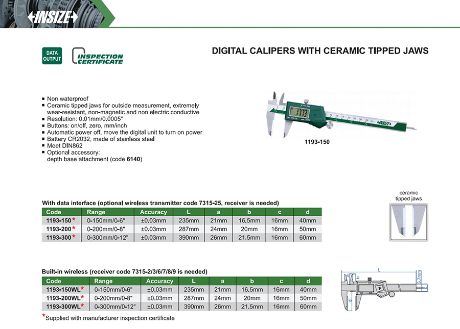 | 1193-150WL | 0-150mm/0-6" | ±0.03mm | 0.01mm/0.0005" | built-in wireless |