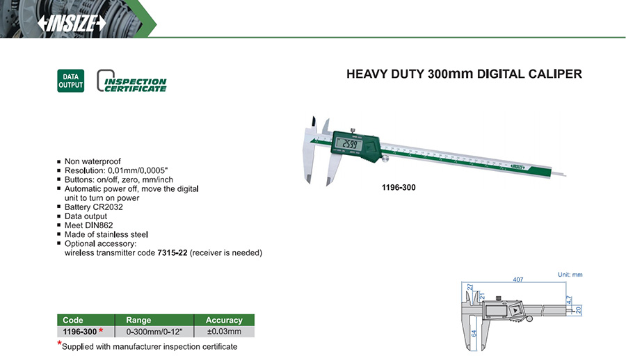 | 1196-300 | 0-300mm/0-12" | ±0.03mm | 0.01mm/0.0005" | with data interface |