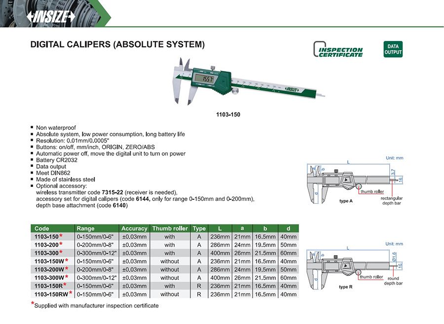 | 1103-150R | 0-150mm/0-6" | ±0.03mm | 0.01mm/0.0005" | with data interface | with |