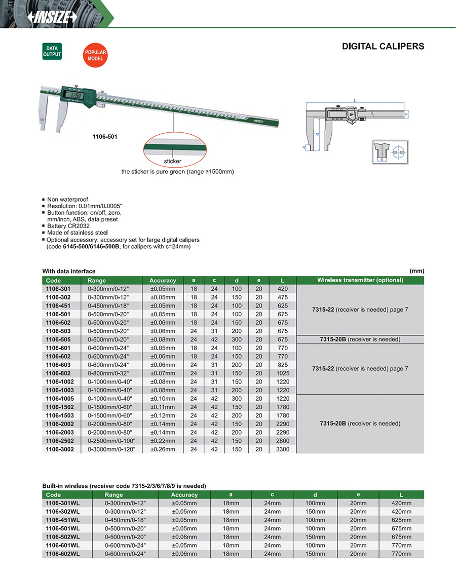 1106-301WL 0-300mm/0-12" ±0.05mm 0.01mm/0.0005" built-in wireless