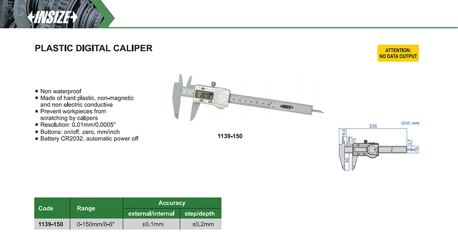 | 1139-150 | 0-150mm/0-6" | external/internal: ±0.1mm, step/depth: ±0.2mm | 0.01mm/0.0005" | without data interface |