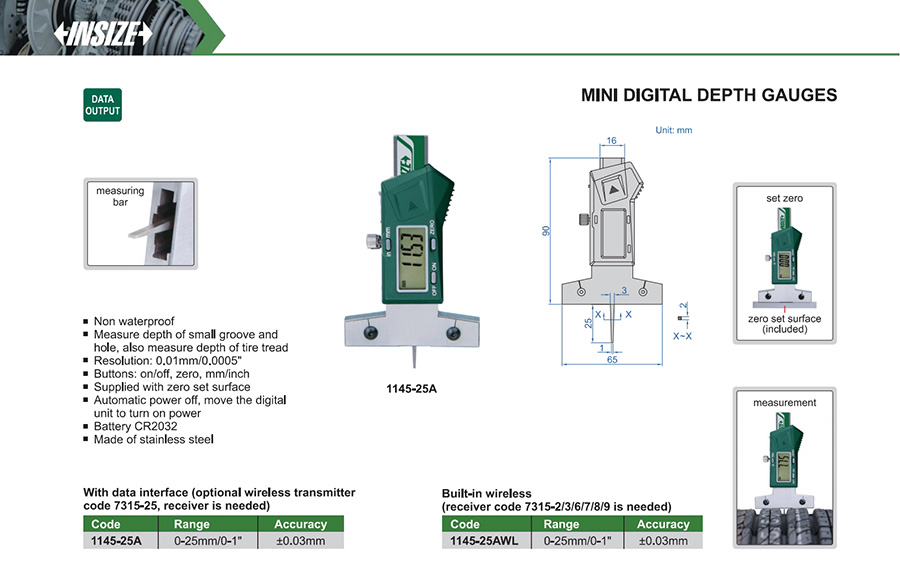 | 1145-25A | 0-25mm/0-1" | ±0.03mm | 0.01mm/0.0005" | with data interface |