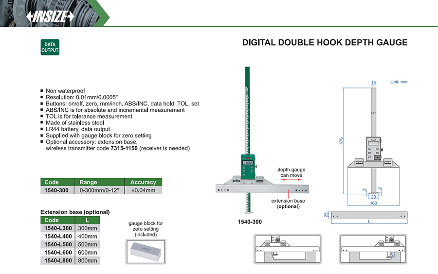 | 1540-300 | 0-300mm/0-12" | ±0.04mm | 0.01mm/0.0005" | with data interface |