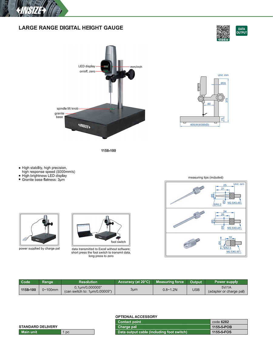 | 1158-100 | 0~100mm | 3µm | 0.1µm/0.000005" (can switch to: 1µm/0.00005") |