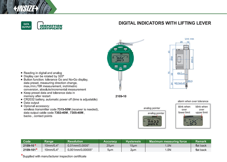 Button function: tolerance Go and No-Go display, data preset, measuring direction change, max./min./TIR measurement, inch/metric conversion, absolute/incremental measurement