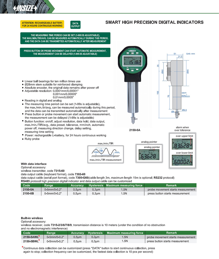 | 2150-5AWL | 0-5mm/0-0.2" | 0.5µm | 0.0001mm/0.00001" |