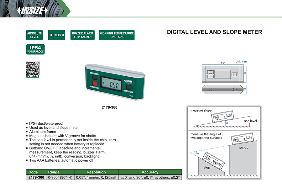 | 2179-360 | 0-360° (90°×4) | at 0° and 90°: ±0.1°; at others: ±0.2° | 0.05°; 1mm/m; 0.125in/ft | no |