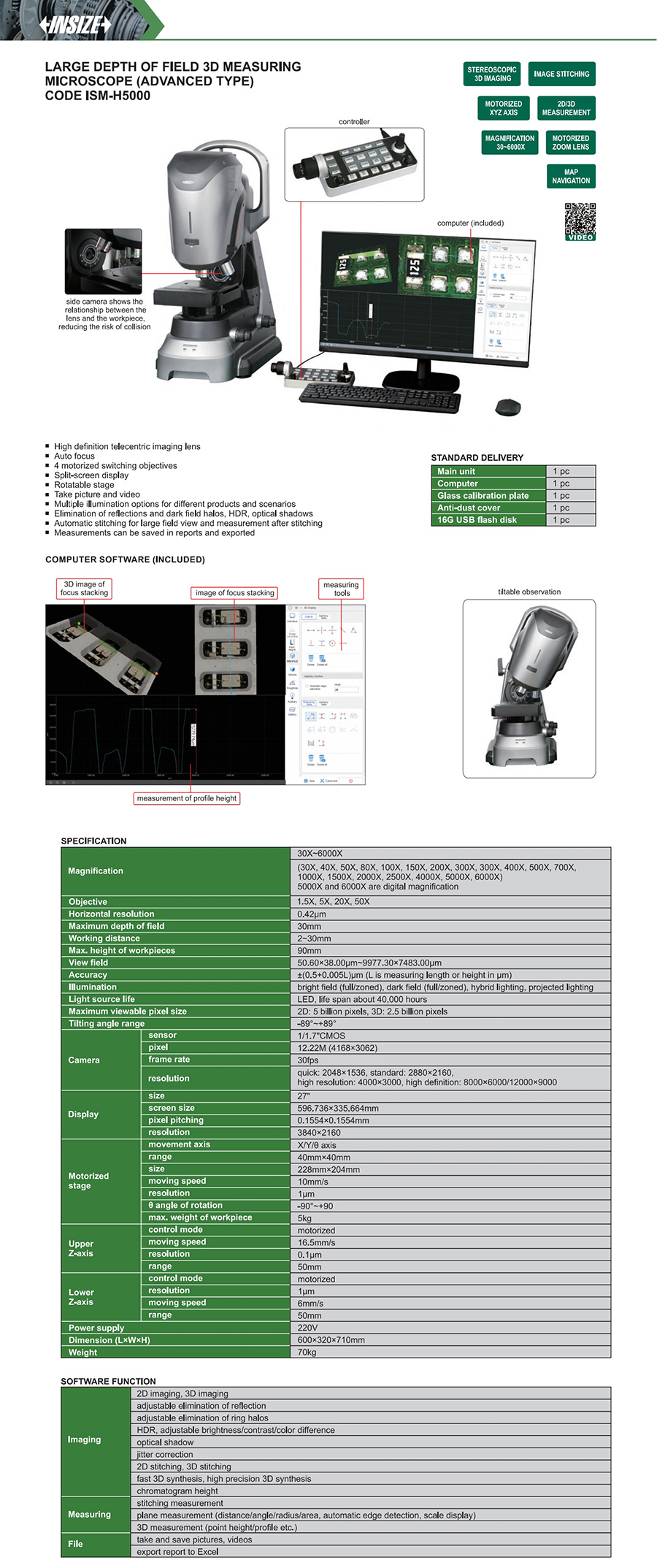 | ISM-H5000 | large depth of field 3D measuring microscopes | 30X~6000X | 50.60 38.00μm~9977.30 7483.00μm | 12.22M (4168×3062) |
