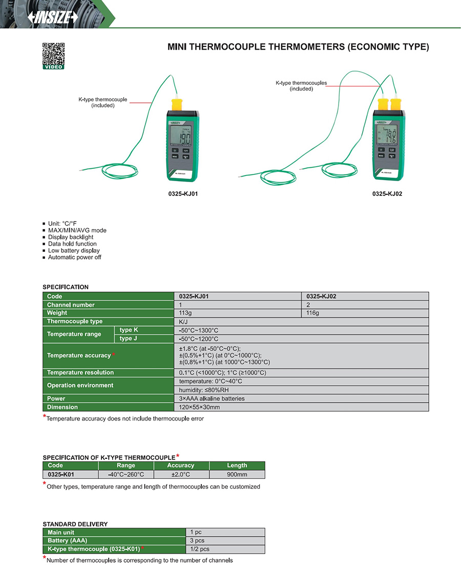 | 0325-KJ02 | J | thermocouple | ±1.8°C (at -50°C~0°C); ±(0.5%+1°C) (at 0°C~1000°C); ±(0.8%+1°C) (at 1000°C~1300°C) | 2 | -50°C~1200°C |