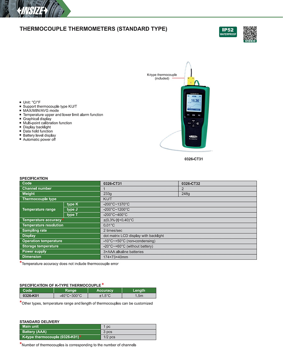 | 0326-CT31 | J | thermocouple | ±(0.3%∙|t|+0.40)°C | 1 | -200°C~1200°C |