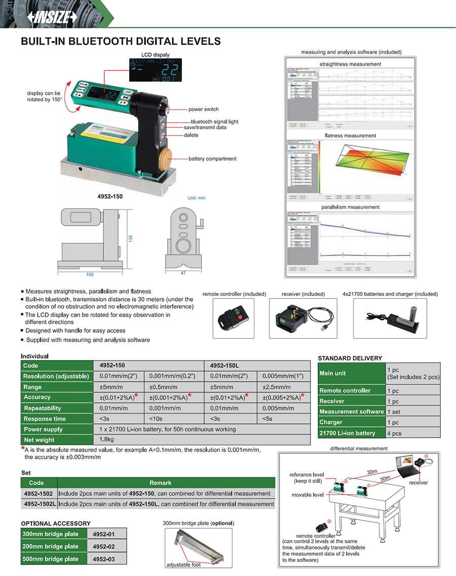 | 4952-150L | ±5mm/m | ±(0.01+2%A) | 0.01mm/m (2") | 0.01mm/m |