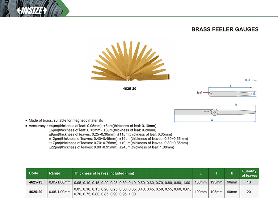 Accuracy : ±4µm(thickness of leaf: 0.05mm), ±5µm(thickness of leaf: 0.10mm), ±6µm(thickness of leaf: 0.15mm), ±8µm(thickness of leaf: 0.20mm), ±9µm(thickness of leaves: 0.25~0.30mm), ±11µm(thickness of leaf: 0.35mm) ,±12µm(thickness of leaves: 0.40~0.45mm), ±14µm(thickness of leaves: 0.50~0.65mm) ,±17µm(thickness of leaves: 0.70~0.75mm), ±19µm(thickness of leaves: 0.80~0.85mm) ,±22µm(thickness of leaves: 0.90~0.95mm), ±24µm(thickness of leaf: 1.00mm)