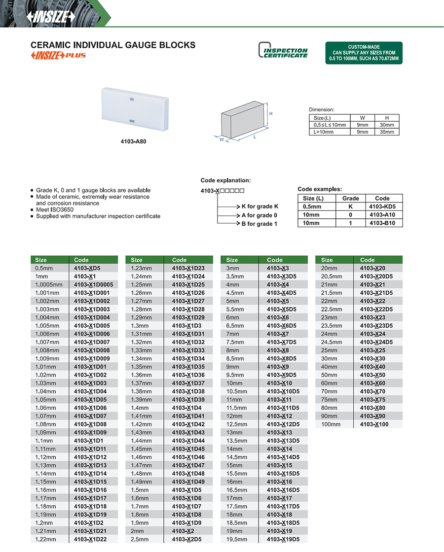 Grade K, 0 and 1 gauge blocks are available