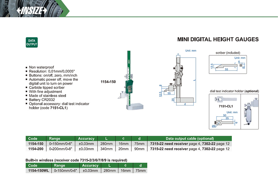 | 1154-150 | 0-150mm/0-6" | ±0.03mm | 0.01mm/0.0005" | with data interface |
