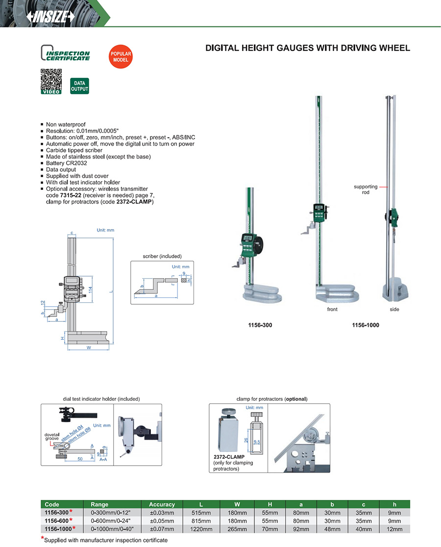 | 1156-300 | 0-300mm/0-12" | ±0.03mm | 0.01mm/0.0005" |