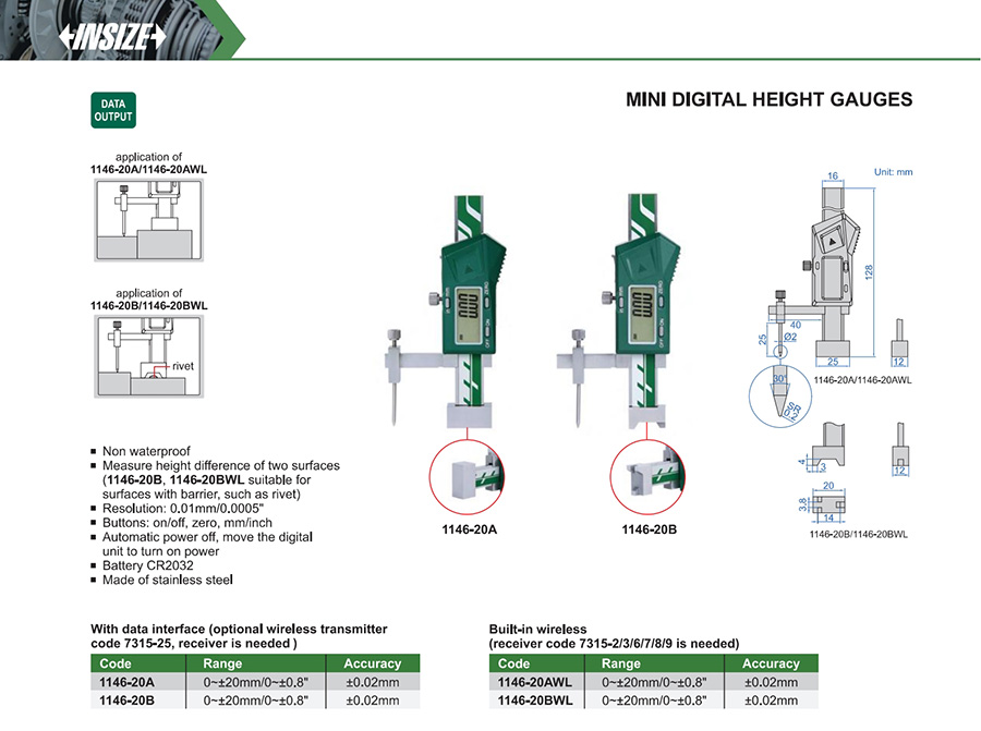 | 1146-20BWL | 0~±20mm/0~±0.8" | ±0.02mm | 0.01mm/0.0005" |