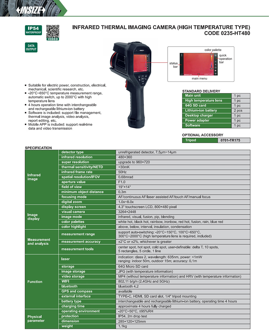 0235-HT480 support auto-switching: -20°C~150°C, 100°C~650°C, 300°C~2000°C (high temperature lens is required, included) 480×360 AF/continuous AF/laser assisted AF/touch AF/manual focus yes
