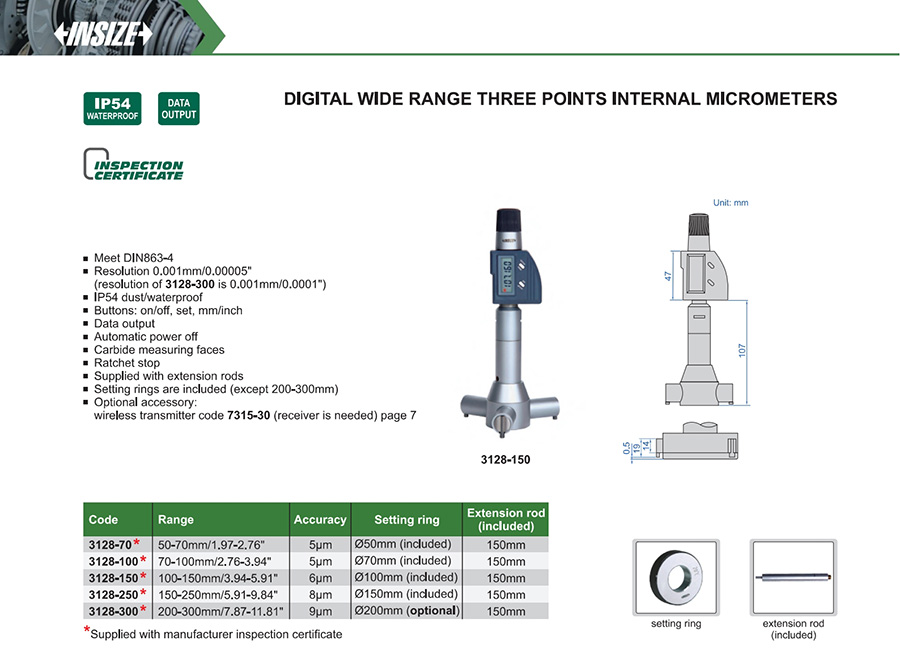 | 3128-250 | 150-250mm/5.91-9.84" | 8μm | 0.001mm/0.00005" |