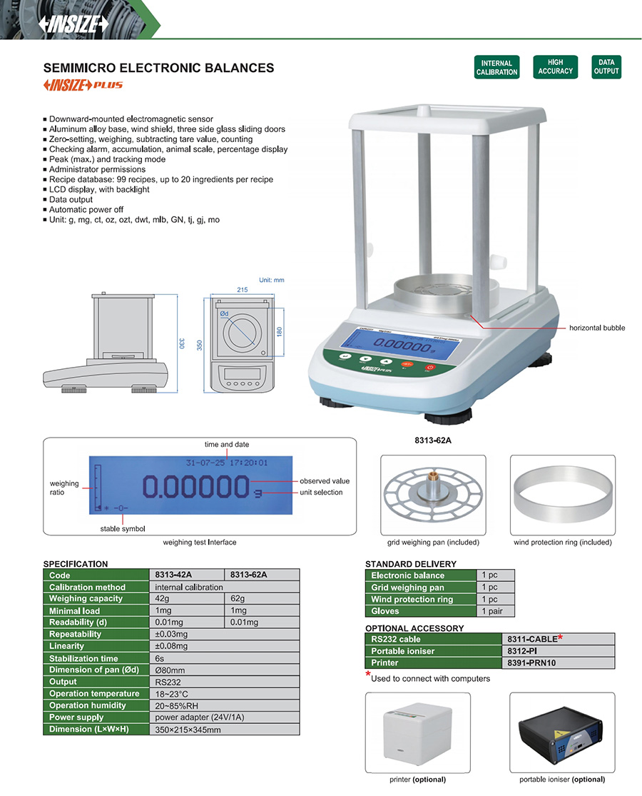 Code Weighing capacity Readability (d) Internal calibration Dimension of pan