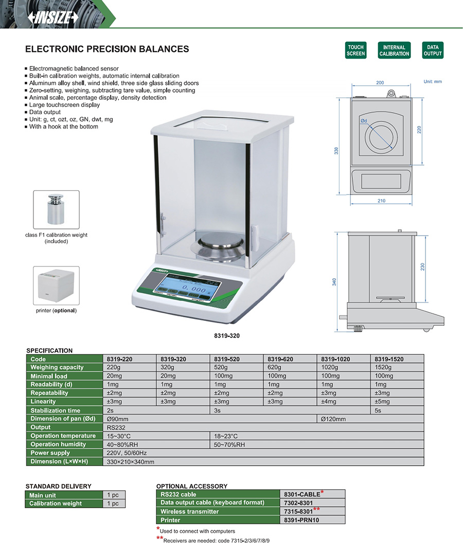 Code Weighing capacity Readability (d) Internal calibration Dimension of pan