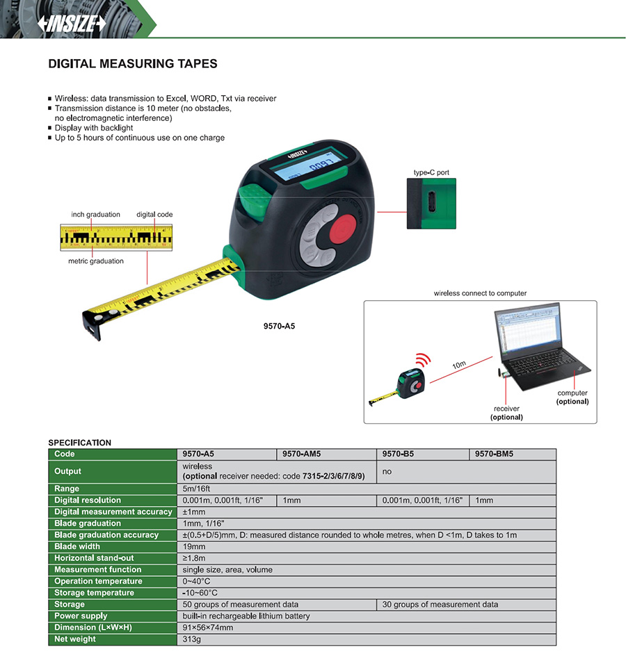 | 9570-B5 | 5m/16ft | ±1mm/±(0.5+D/5000)mm | 0.001m, 0.001ft, 1/16" | no |