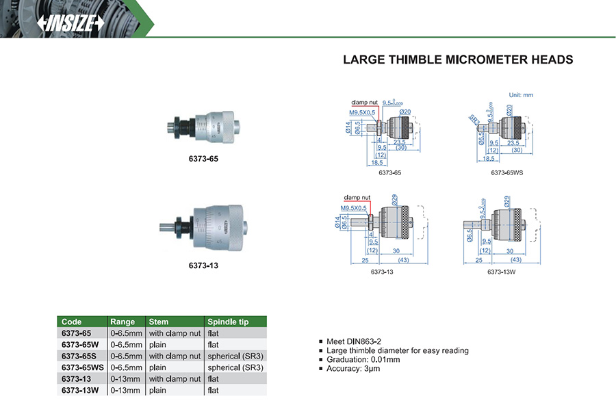| 6373-13 | 0-13mm | 3μm | 0.01mm | with clamp nut | flat |
