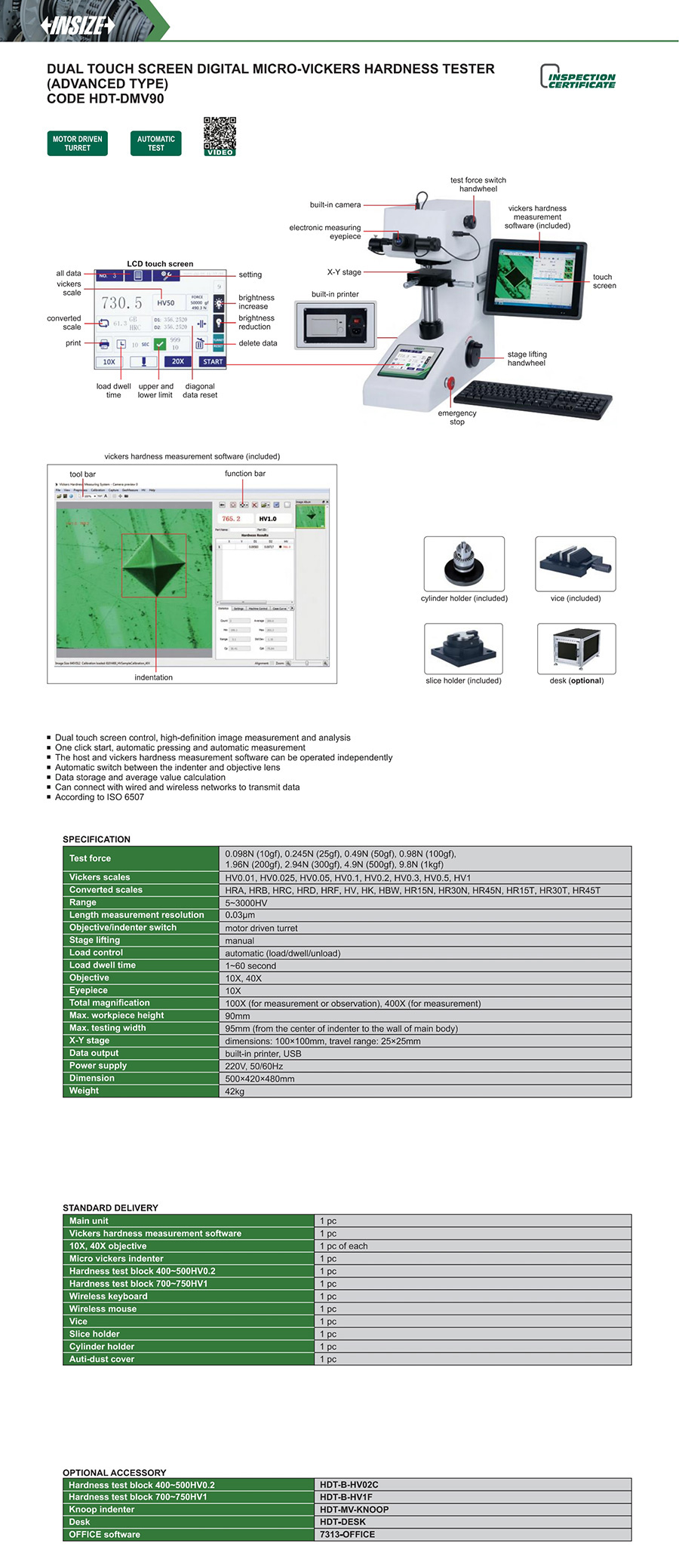 | HDT-DMV90 | automatic (load/dwell/unload) | 90mm | 95mm | HV0.01~HV1 | 100X (for measurement or observation), 400X (for measurement) |