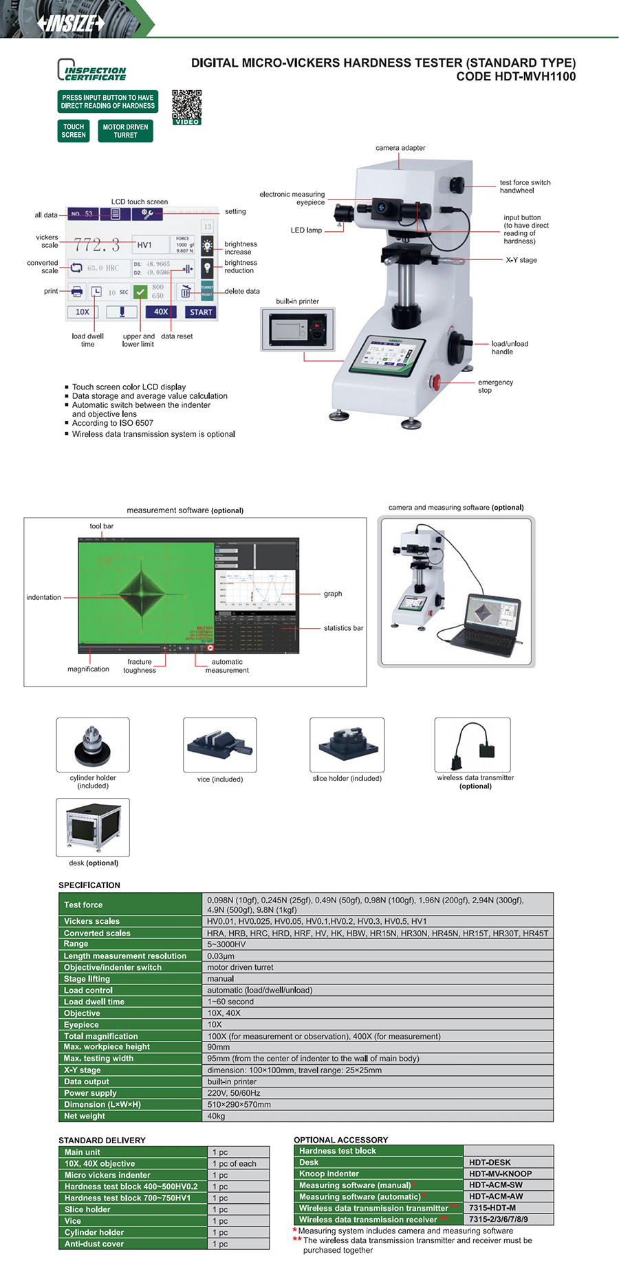 | HDT-MVH1100 | automatic (load/dwell/unload) | 90mm | 95mm | HV0.01~HV1 | 100X (for measurement or observation), 400X (for measurement) |
