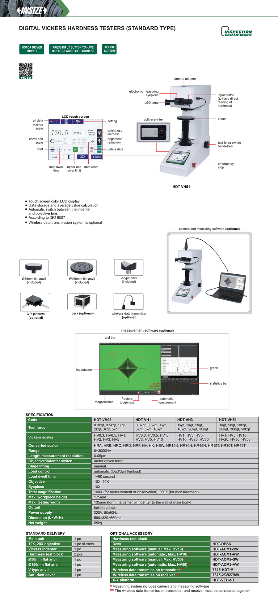 | HDT-VH51 | automatic (load/dwell/unload) | 175mm | 135mm | HV1~HV50 | 100X (for measurement or observation), 200X (for measurement) |