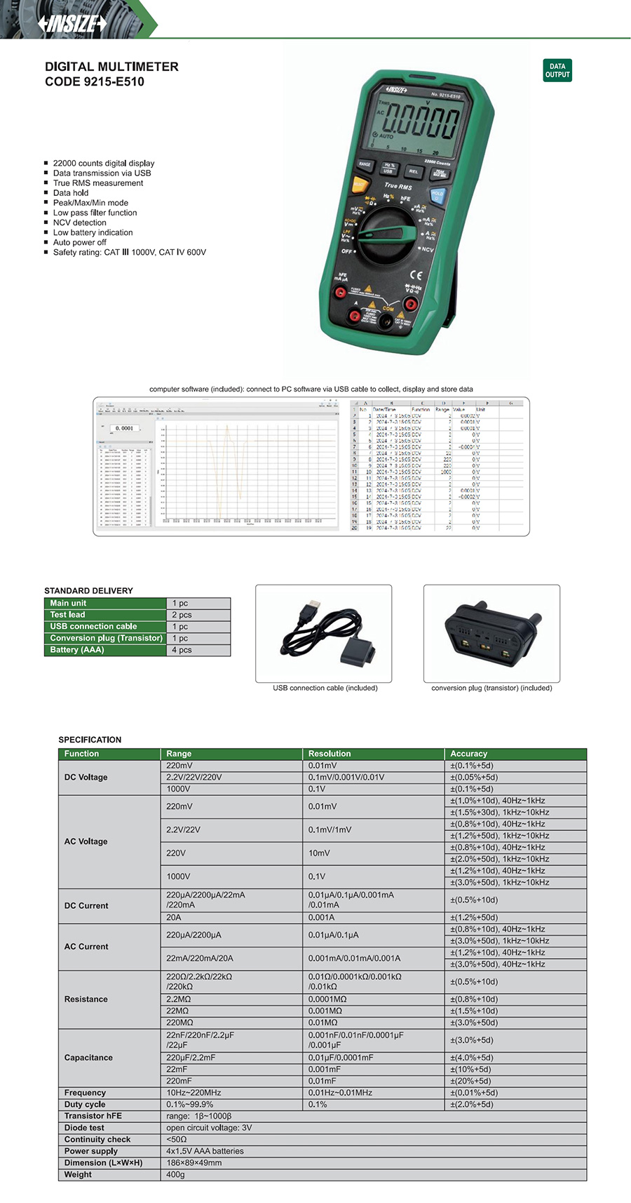 | 9215-E510 | 4 ½ | 20A | 20A | 1000V | 1000V | ±(0.05%+5d) | no | yes | USB |
