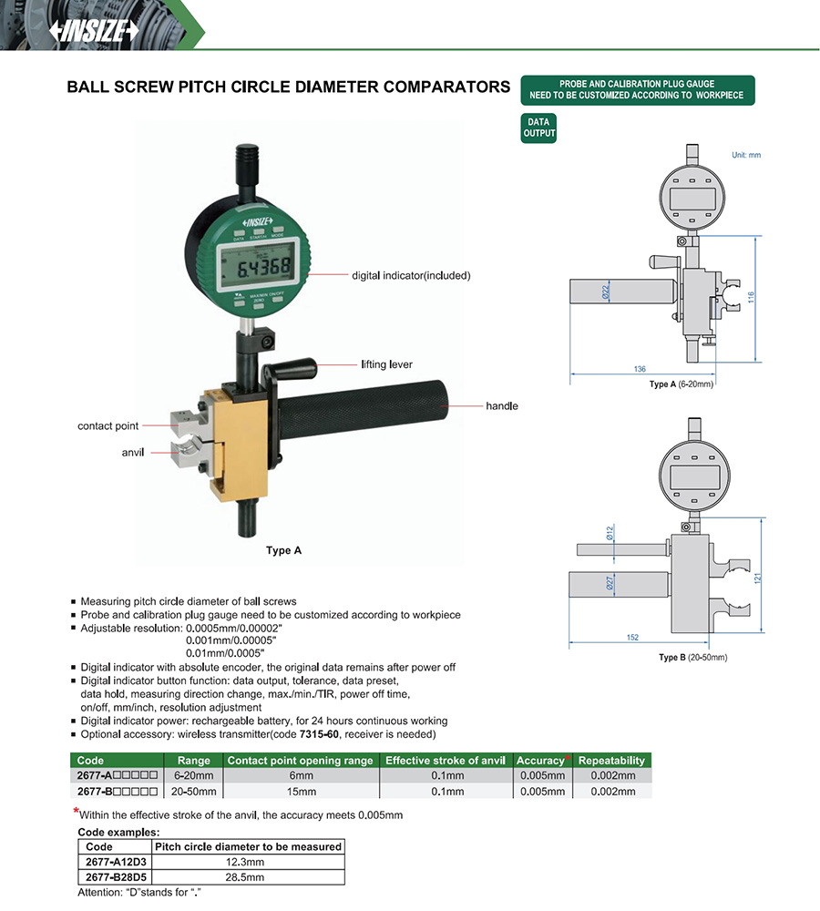 | 2677-A□□□□□ | 6-20mm | 0.005mm | 0.0005mm/0.00002", 0.001mm/0.00005", 0.01mm/0.0005" |