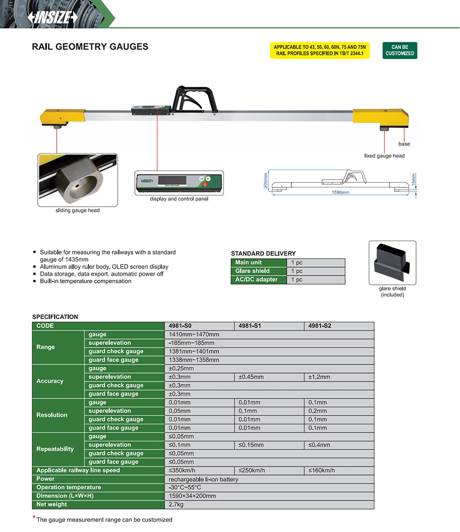 4981-S0 Gauge range:1410mm~1470mm,Superelevation range:-185mm~185mm Gauge accuracy:±0.25mm,Superelevation accuracy:±0.3mm
