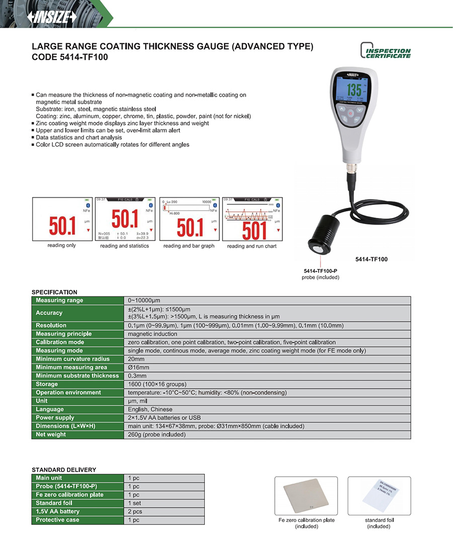 | 5414-TF100 | 0~10000µm | ±(2%L+1µm): ≤1500µm, ±(3%L+1.5µm): >1500µm | 0.1μm (0~99.9μm), 1μm (100~999μm), 0.01mm (1.00~9.99mm), 0.1mm (10.0mm) | no |