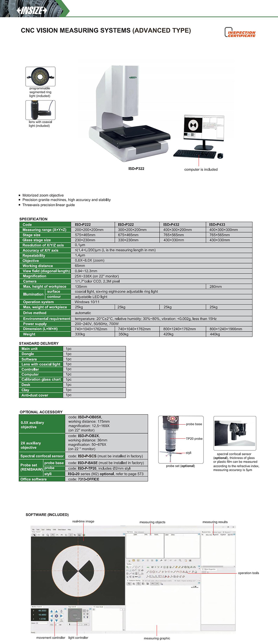 ISD-P322 300×200×200mm 25X~338X (on 22'' monitor) 0.6X~8.0X (zoom) ≤(1.4+L/200)µm 0.1µm